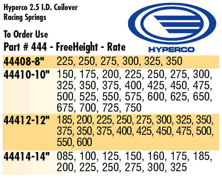 - Choose from three spring rates: 900, 1000 or 1200 lb/in Hypercoil coilover springs