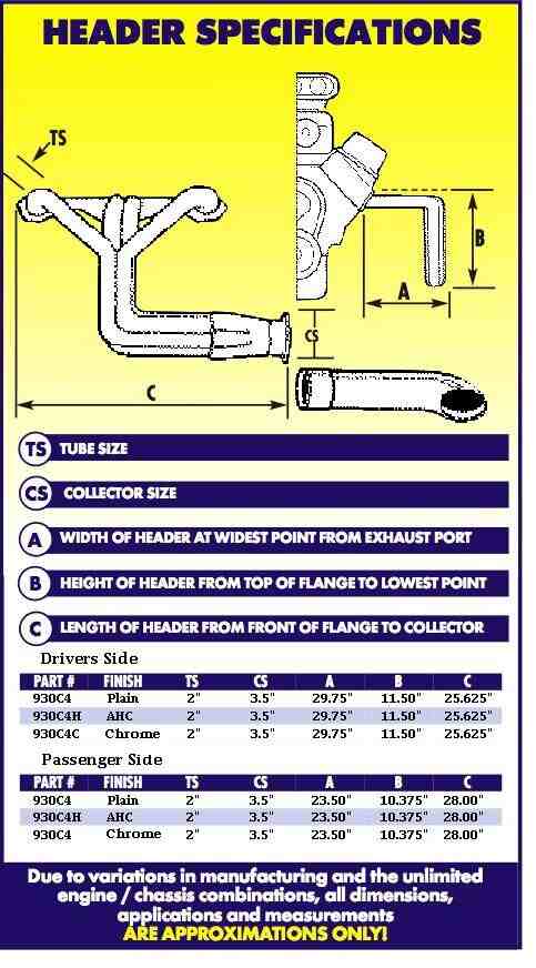 These headers are not for the faint of heart since you must cut the inner fender panels to make them fit, and tire clearance can be a problem on some applications. They may require smaller front tires to avoid contact. The stock emergency brake rod must also be altered. Can be used with most oil filter systems or transmission and starter combinations. The headers are designed to be used with engines in the stock location, not lowered as many kits do, so all '55-'57 cars should check motor mount positioning before ordering.