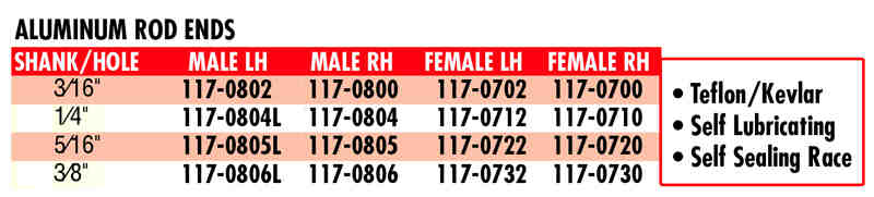 Aluminum rod ends are a close tolerance, 3-piece, medium duty design. Hard anodized 7075-T6 aerospace quality aluminum body. Heat treated, 5210 precision ground ball, Kevlar race. Self lubricating Teflon liner seals out dirt and debris.
