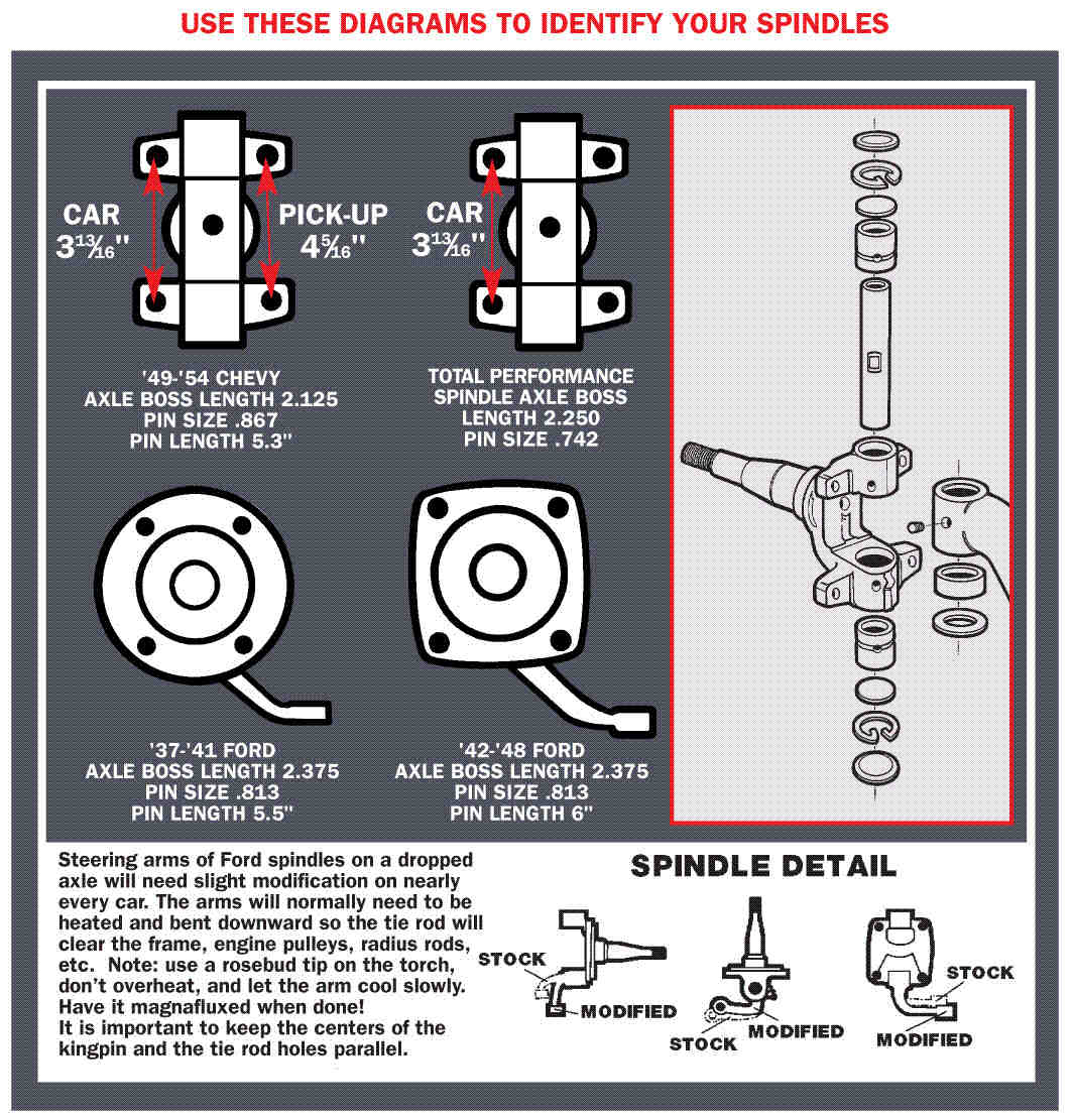 Ford-style spindles are generally your best choice when using an original Ford axle or an aftermarket I-beam axle. This spindle is a reproduction version of the 1937-41 spindle. Ford used the same king pin dimensions and geometry on the 1928-48 axles, therefore you can use any 1937-48 Ford spindle on any 1928-48 car axle.